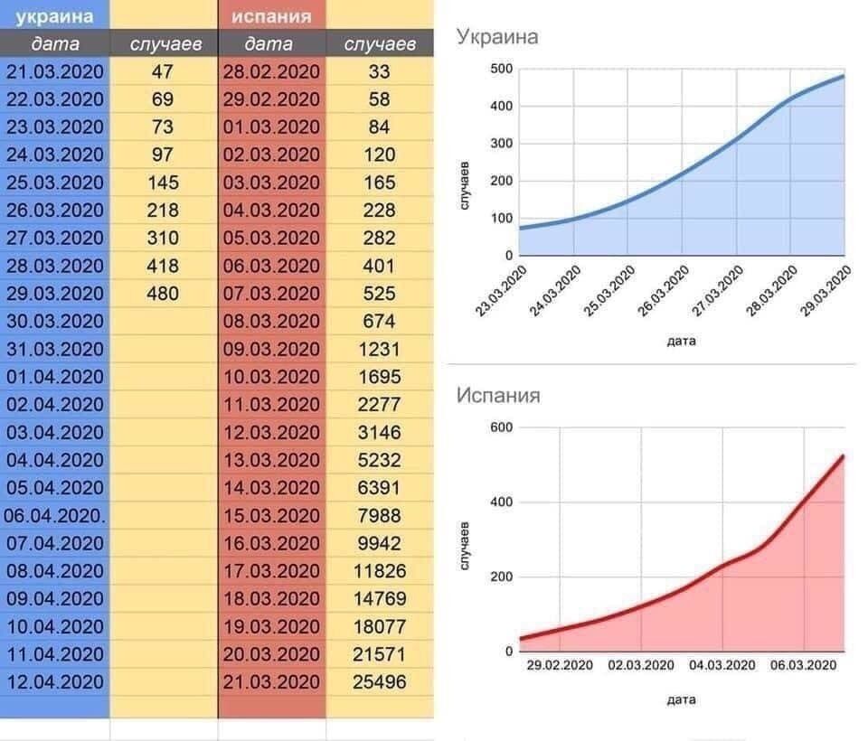 Но не стоит заниматься самообманом, тяжелые времена еще впереди. Сравните динамику выявления инфицированных в Украине и в Испании. 28 февраля в Испании было выявлено всего лишь 33 инфицированных. А всего через 21 день среди инфицированных было уже 25 496 человек! В Украине на 21 марта было выявлено 47 заболевших, а уже через 11 дней – 669 инфицированных.