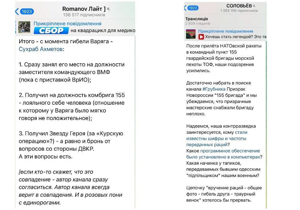 В ответ сторонник Герасимова, главный российский пропагандист Владимир Соловьев обвинил нескольких близких к Гудкову блогеров, в частности Владимира Грубника, в том, что именно они передали в 155-ю бригаду партию радиостанций, через которые украинцы могли получить доступ к системе связи. Вот также скрин с канала Соловьева.
