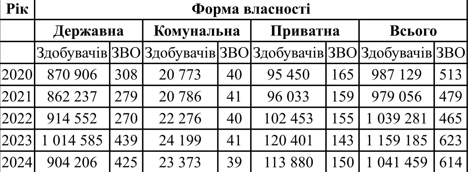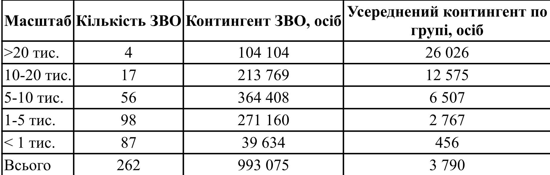 Распределение высших учебных заведений (вузов) всех форм собственности по количеству получающих образование (таблица №3) свидетельствует, что в четырех крупнейших университетах сосредоточено 104 104 соискателя. Речь идет о: Киевском национальном университете имени Тараса Шевченко, Львовском национальном университете имени Ивана Франко, Национальном техническом университете Украины "Киевский политехнический институт имени Игоря Сикорского" и Национальном университете "Львовская политехника".