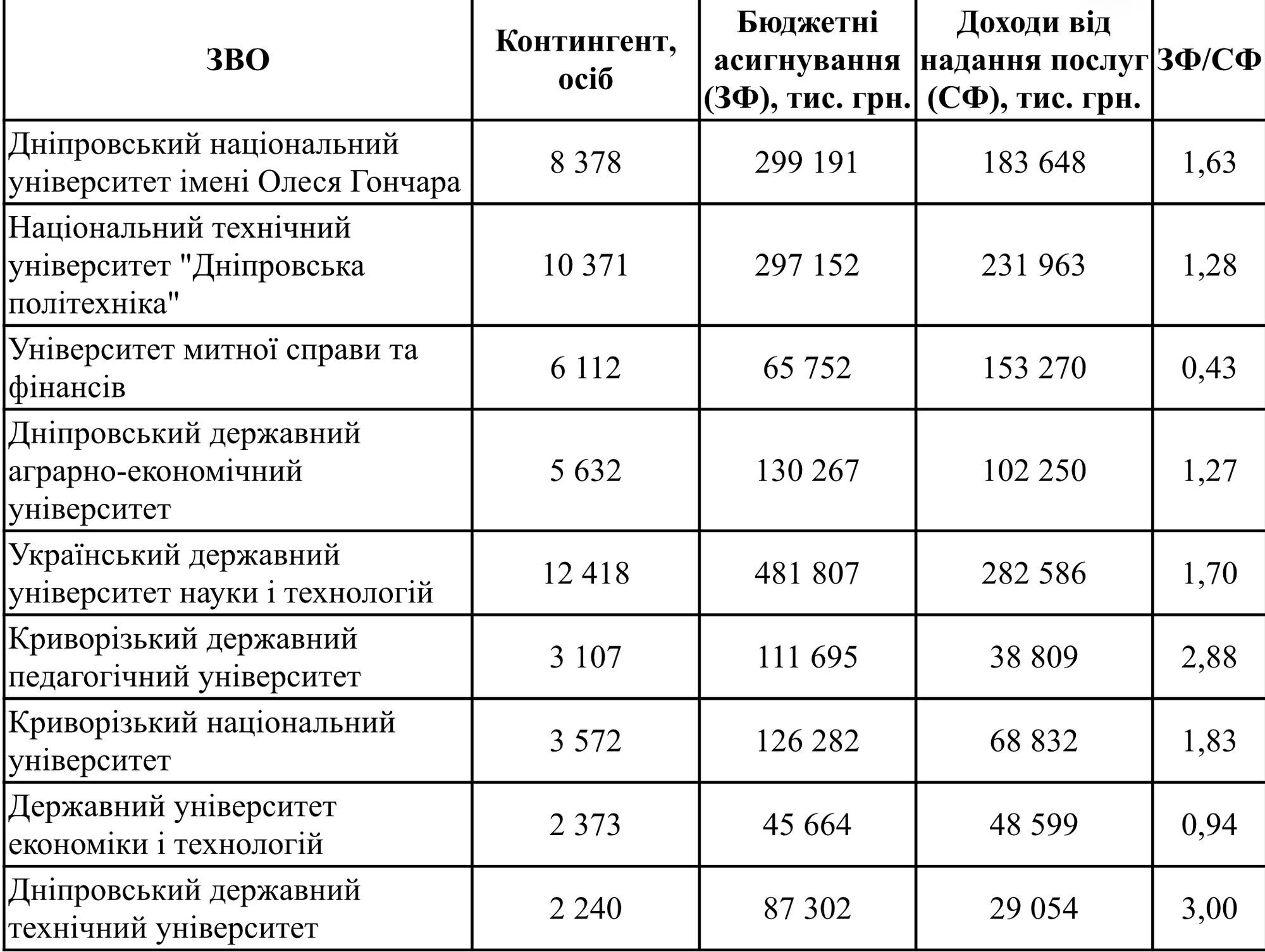 В связи с этим предлагается ввести показатель соотношения между объемами бюджетного финансирования и собственными поступлениями вуза. Рассмотрим на примере вузов Днепропетровской области.