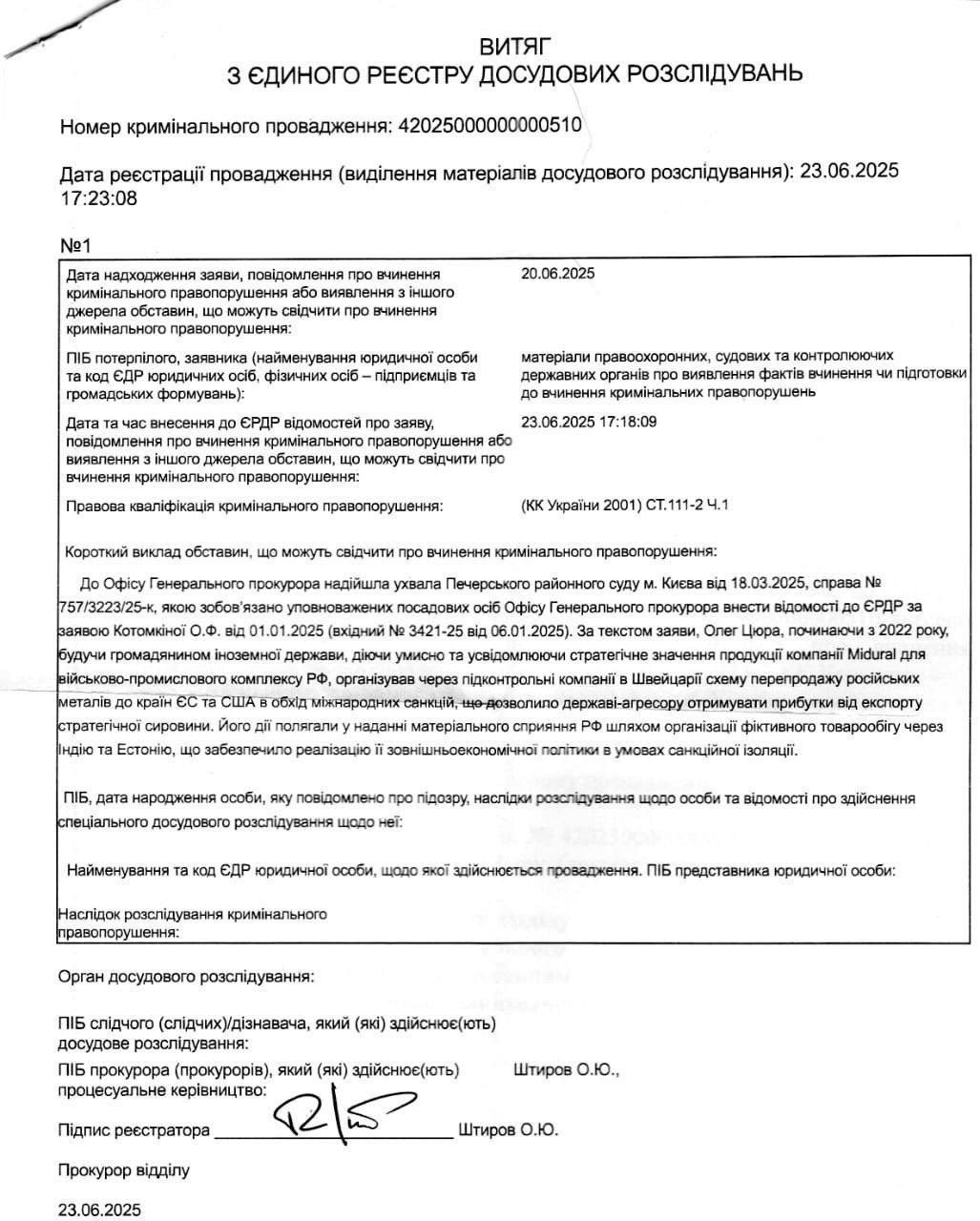 И вот наконец украинские правоохранители дали оценку деятельности господина Цюры. Вернее, начали давать. В выписке прямо говорится о том, что начиная с 2022 года Олег Цюра, гражданин иностранного государства, "осознавая стратегическое значение продукции компании MidUral для ВПК РФ, организовал через подконтрольные компании в Швейцарии схему реэкспорта российских металлов, в том числе в США, в обход санкций", используя "перемаркировку" происхождения через Индию и Эстонию.