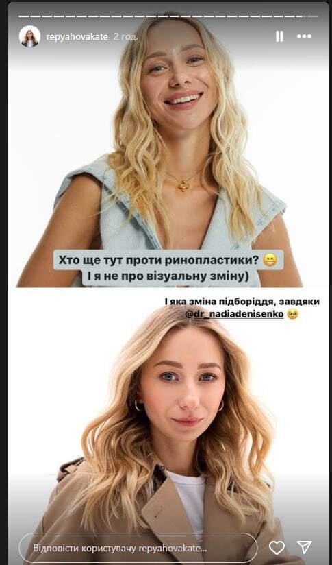 30-летняя жена украинского артиста Виктора Павлика, украинский блогер Катерина Репяхова 12 августа в Instagram Stories разместила коллаж из фото, на которых запечатлена до и после пластической операции на лице.