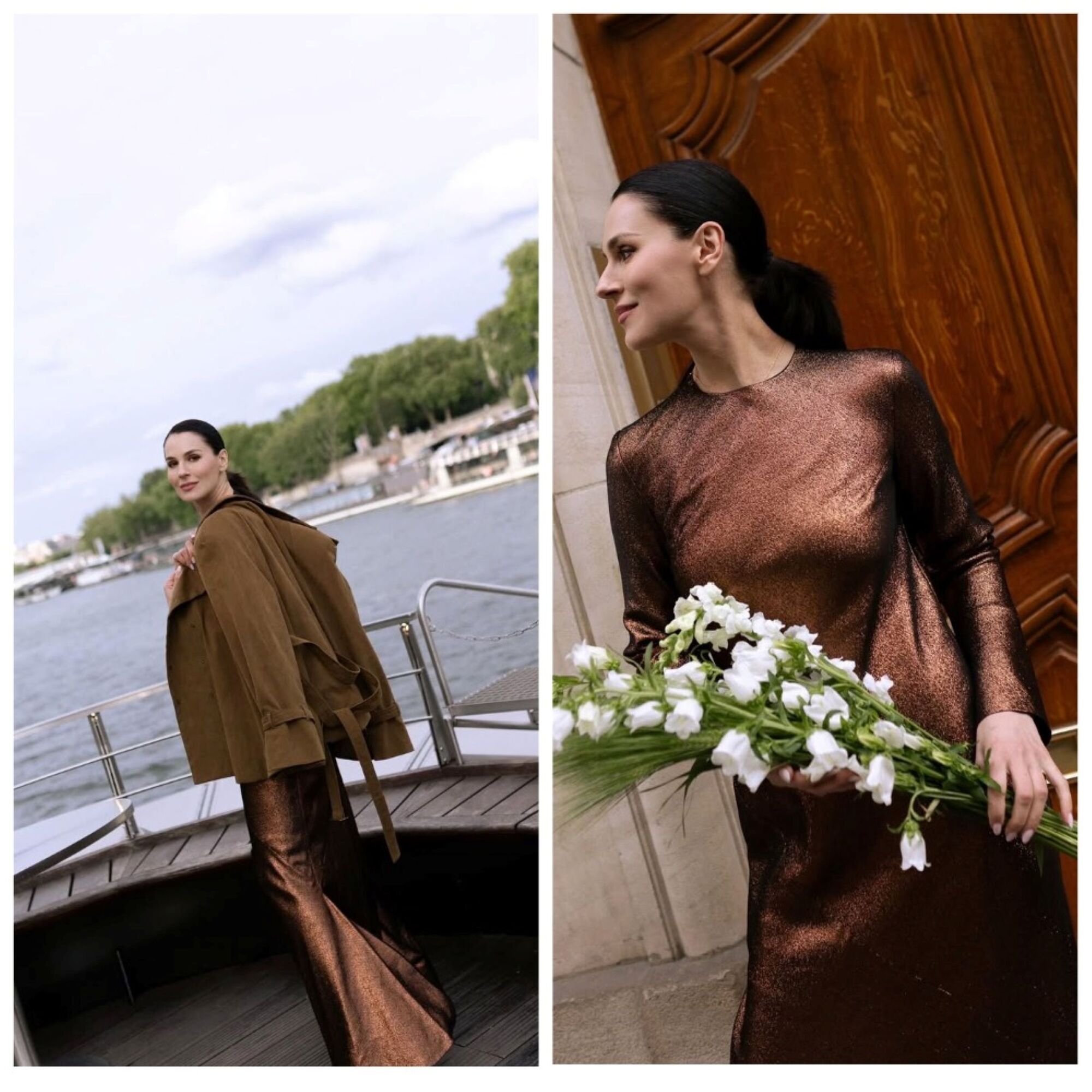 Ведущая сделала фотосет по случаю своего 46-летия. Она выбрала для съемки платье с люрексом коньячного цвета от украинского дизайнера Дианы Ставницер – супруги украинского бизнесмена, основателя Superhumans Center и совладельца портовой компании ТИС Андрея Ставницера.