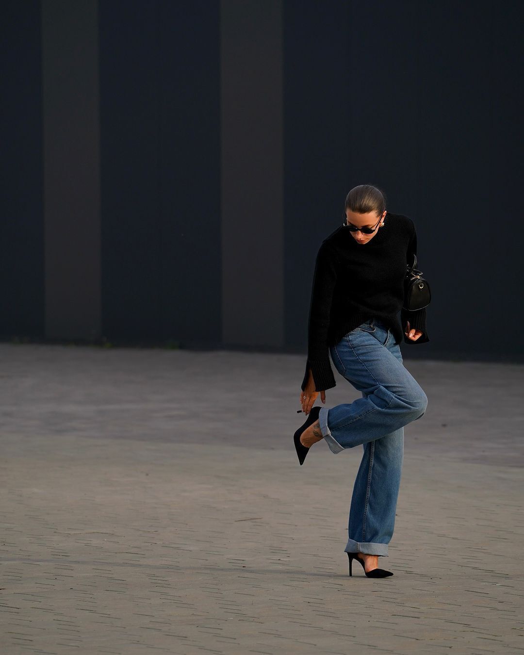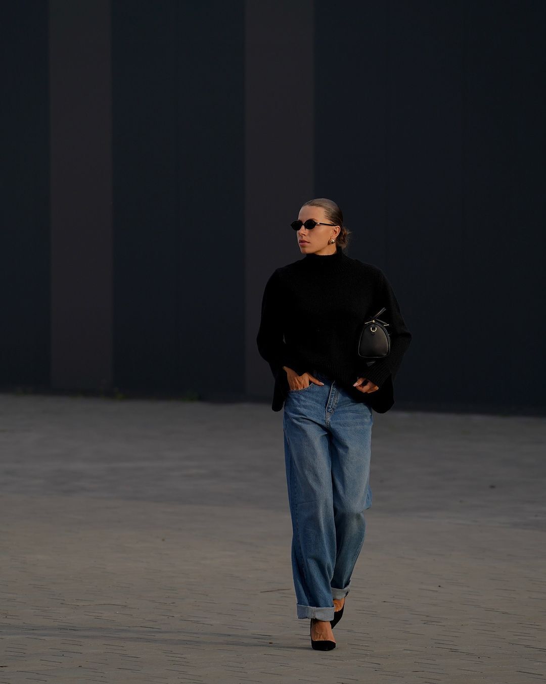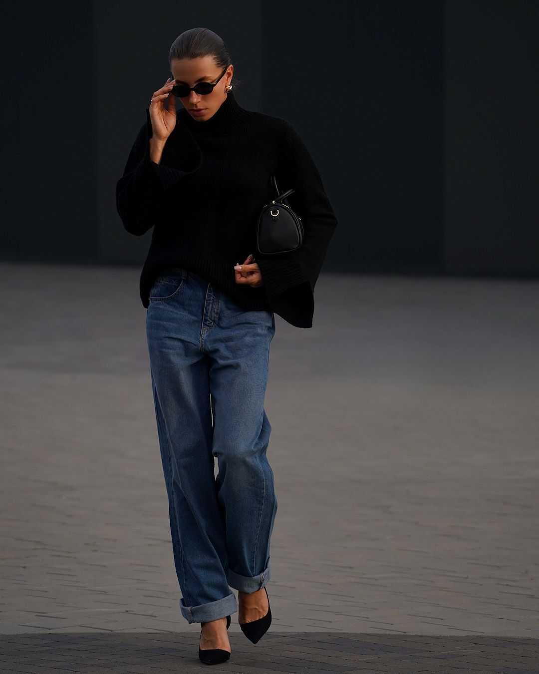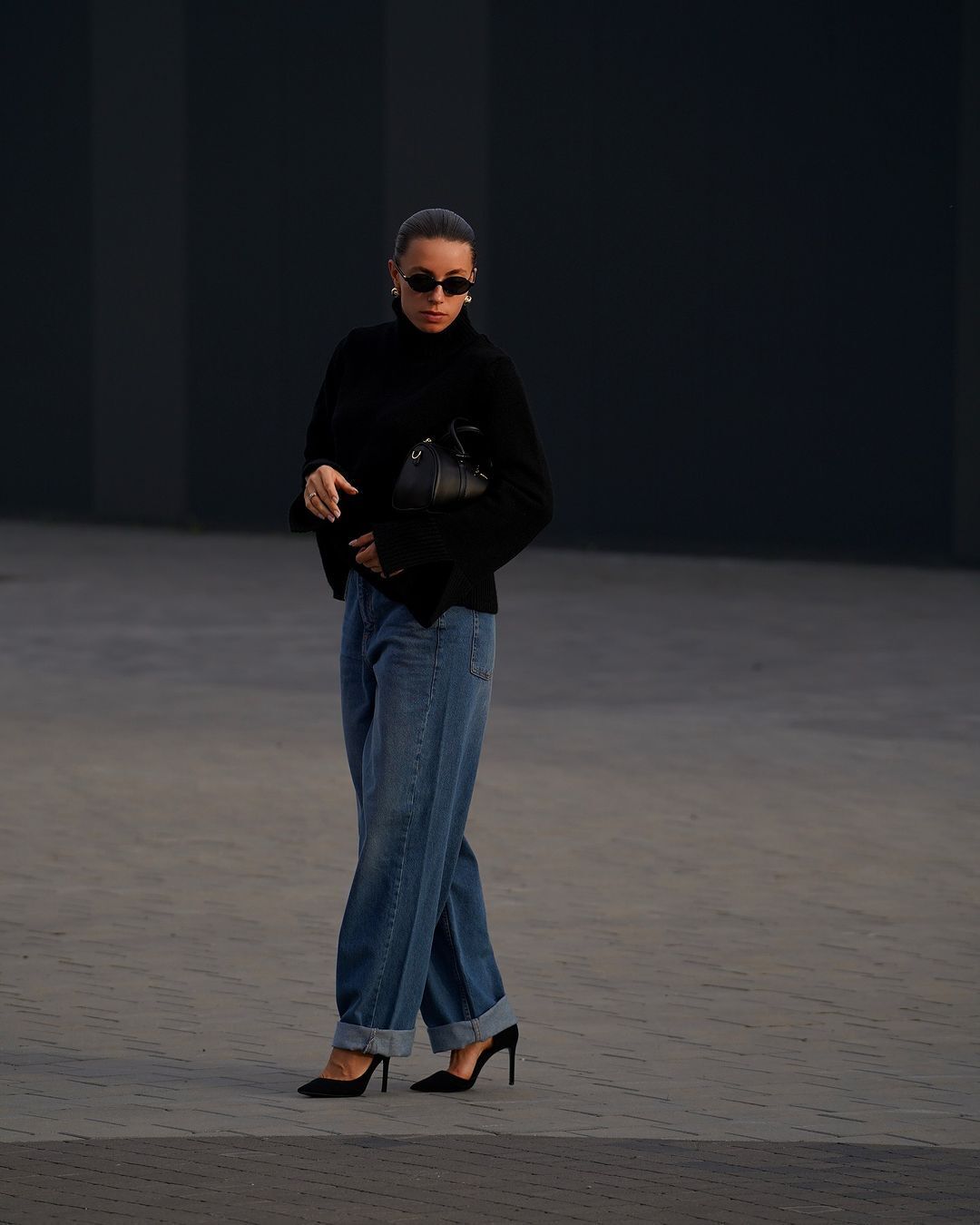 Бех-Романчук надела широкие джинсы и черный свитер. Образ она дополнила туфлями-лодочками на шпильках и сумкой средних размеров, а также массивными серьгами из желтого металла.
