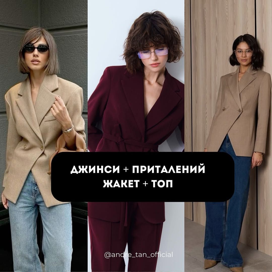 Актуальным сочетанием весны также являются джинсы, приталенный жакет и топ.