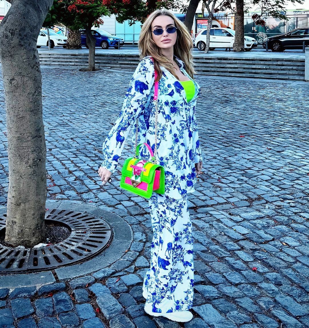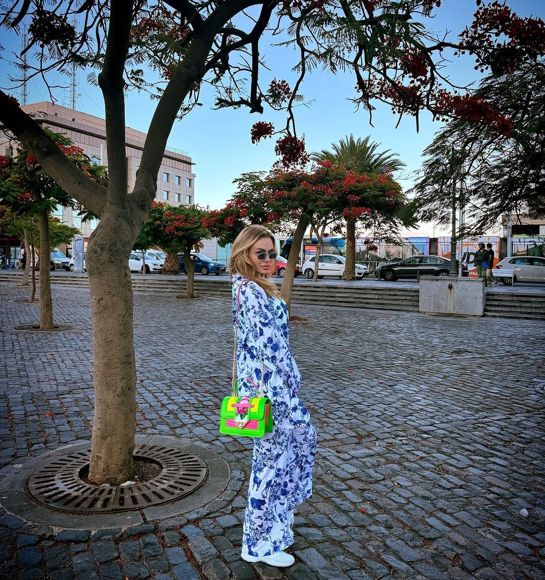 Каминская предстала в брючном костюме с цветочным принтом и неоновом салатовом топе. Сумку она подобрала в тон топу, с вышитой на ней розой. Певица отметила, что это сумка от украинского дизайнера Александры Токаревой.