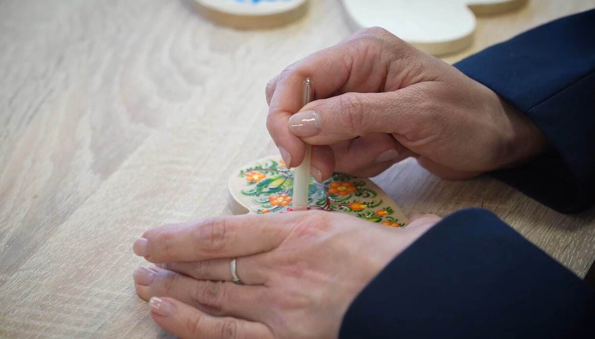 Зеленская пообщалась с мастерами и сама попробовала свои силы в петриковской росписи. В этот момент оператор крупным планом снял маникюр первой леди Украины.