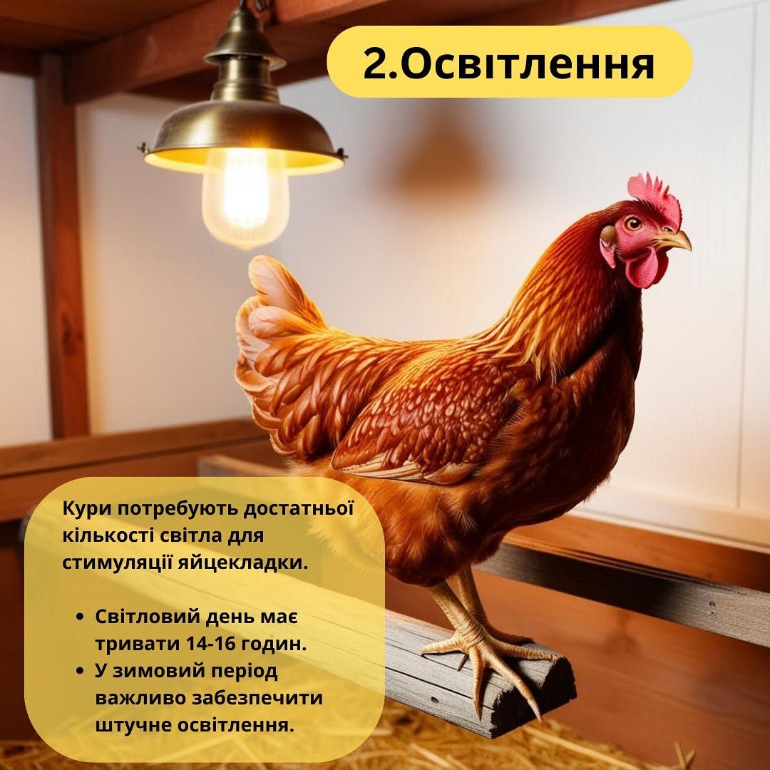 Для стимуляции откладывания яиц курицы нуждаются в достаточном количестве света. Рекомендуется, чтобы световой день составлял около 16 часов, поэтому в зимний период важно обеспечить искусственное освещение.