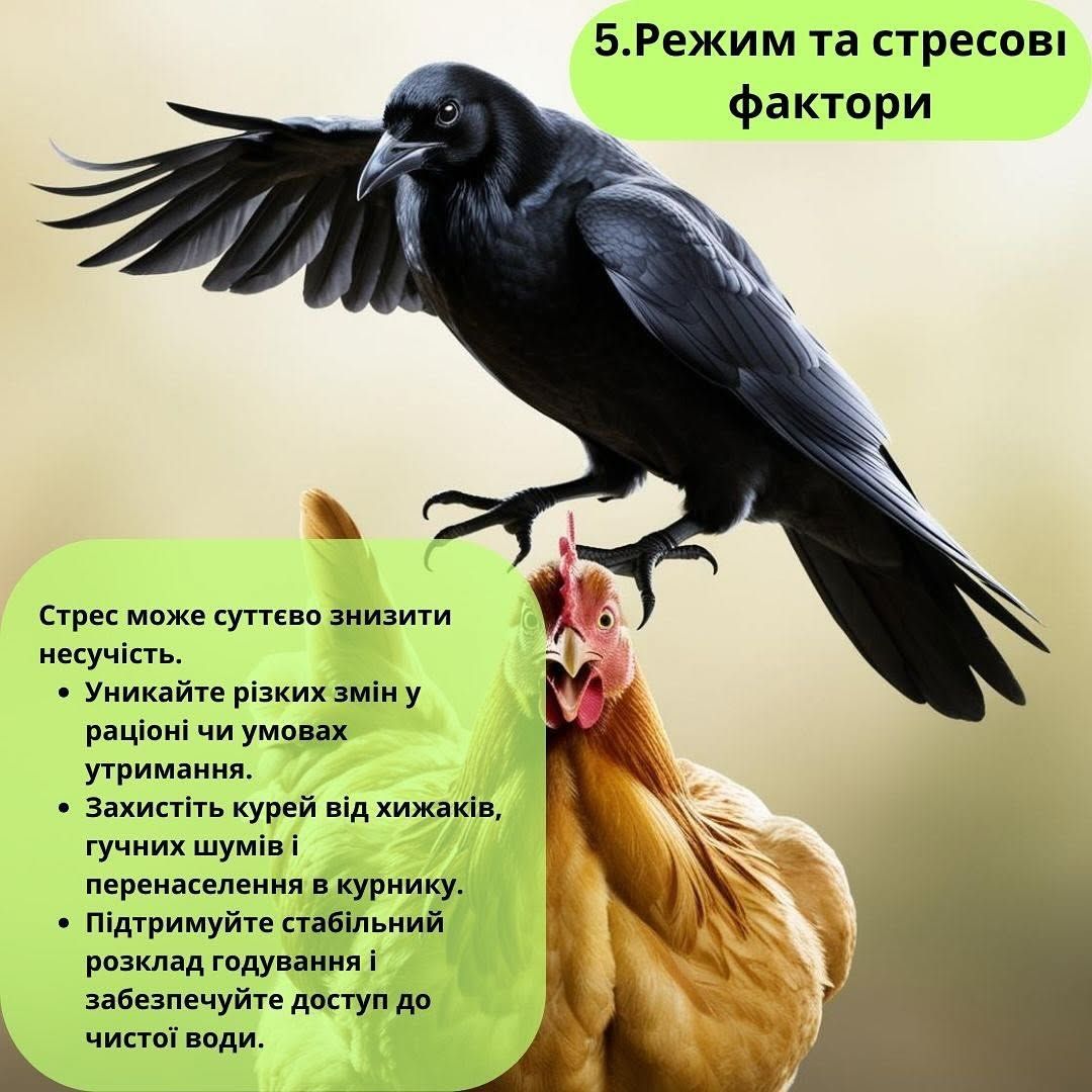 На яйценоскость куриц в значительной мере влияет стресс. Поэтому следует избегать резких перемен в рационе или условиях содержания, а также защитить птицу от хищников и резких звуков в курятнике.