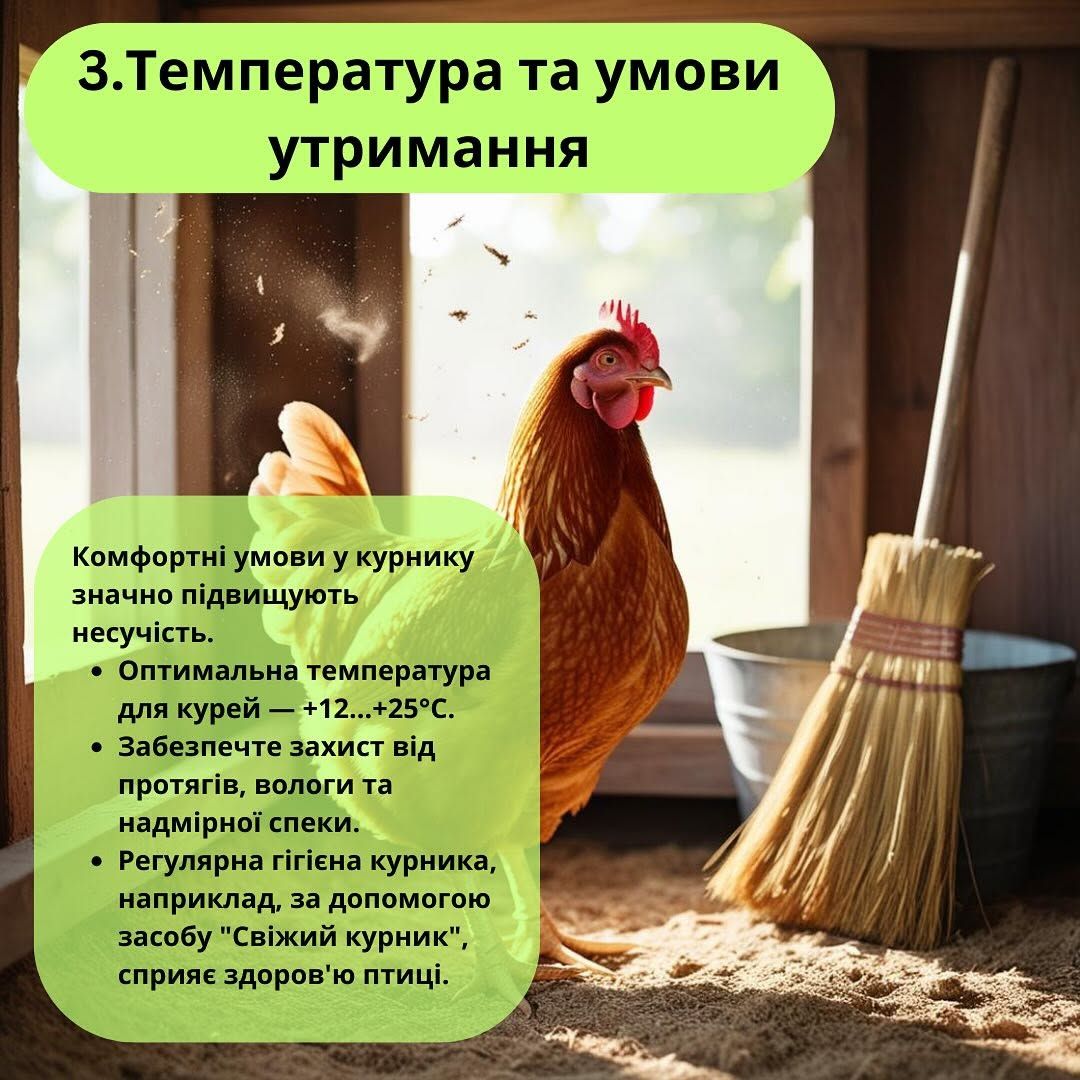 Комфортные условия в курятнике существенно повышают яйценоскость куриц. Оптимальной для них считается температура от +12 до +25 °C. Также важно устранить влажность и сквозняки.