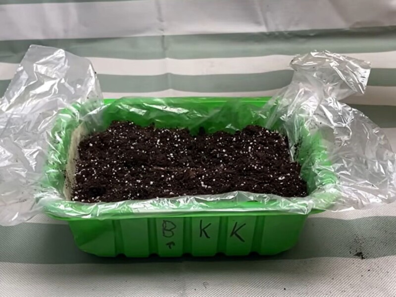 - На дно пластикового контейнера выложите пакет и насыпьте землю, уплотните ее.