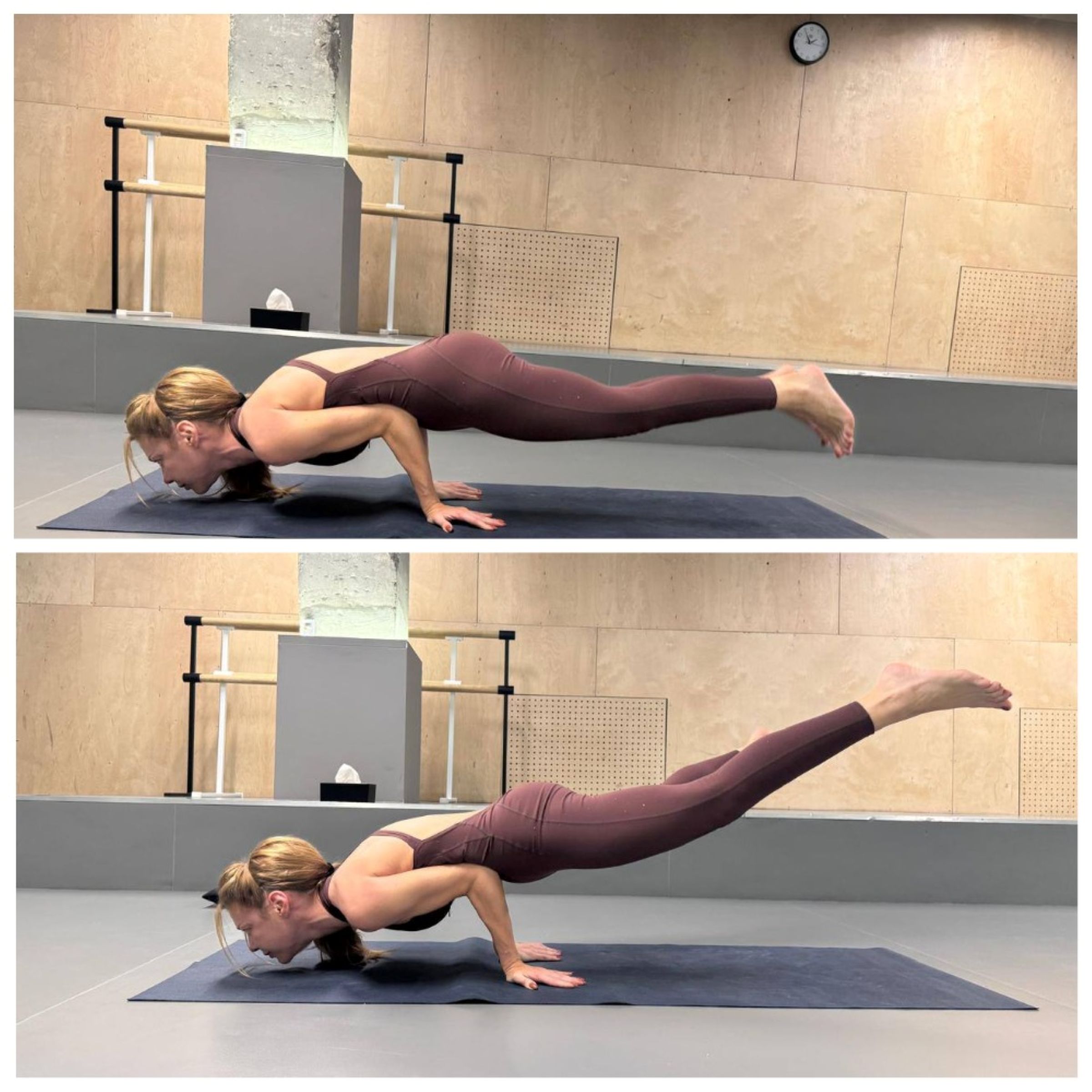 На фото артистка запечатлена во время стойки на руках с поднятыми ногами.