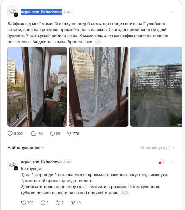 Автор украинского блога aqua_zoo_likhachova в Threads поделилась 25 ноября проверенным лайфхаком, благодаря которому после массированного ракетного удара российских оккупантов по мирному жилому массиву в одном из украинских городов окна в квартире остались целыми.