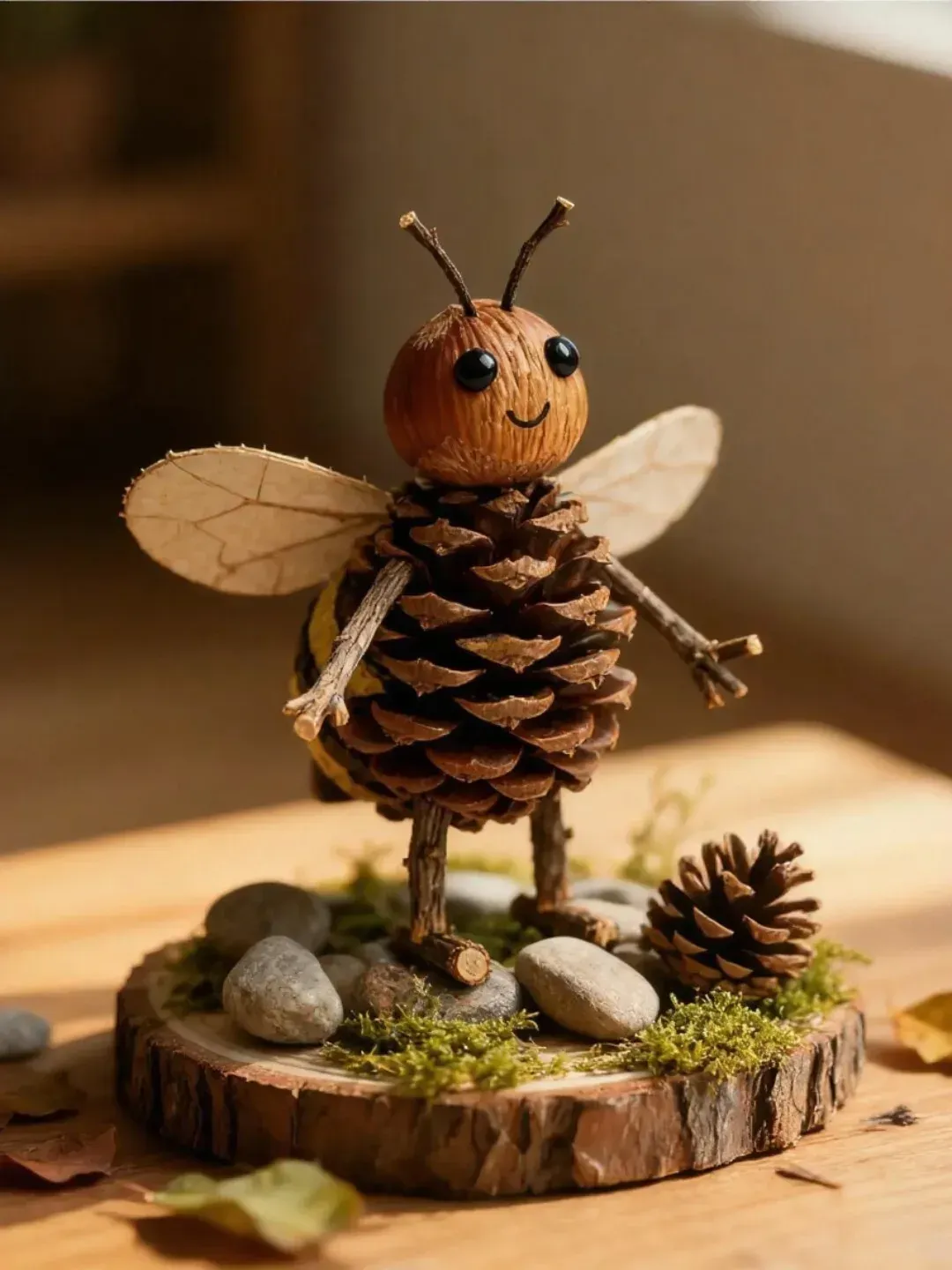 Эта пчела полностью сделана из натуральных материалов. Чтобы смастерить такую же, понадобится грецкий орех для головы, сосновая шишка для тела и веточки для конечностей и усиков. Крылья можно сделать из сухих листьев или бумаги.