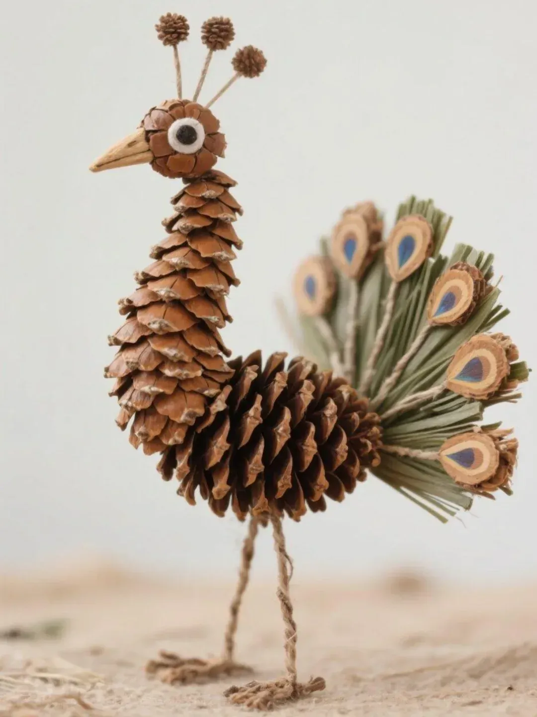 Чтобы сделать такого павлина, понадобятся две шишки для тела, а также другие подручные материалы.