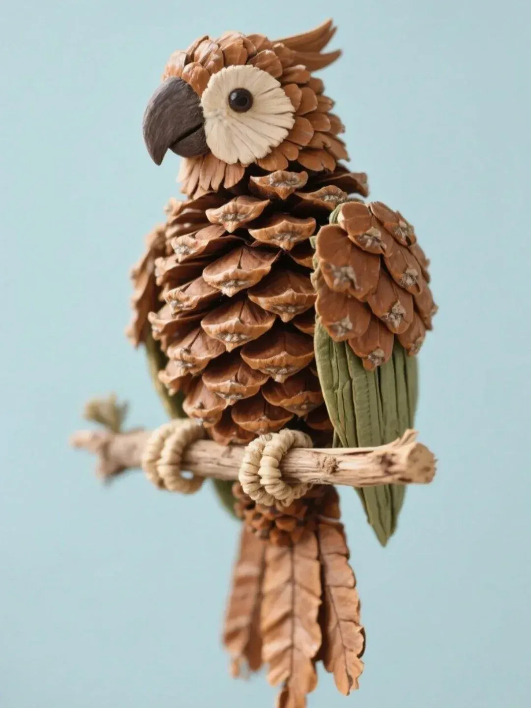 Кроме павлина, из сосновых шишек можно смастерить попугая или сову.