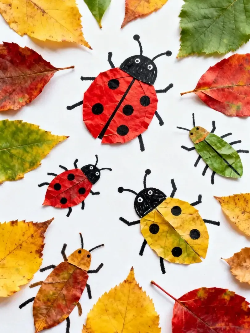 Из опавших листьев можно сделать яркую картину с божьими коровками и другими насекомыми.