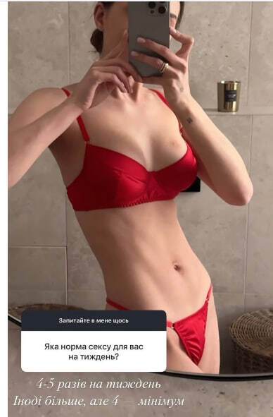 Жена украинского ведущего Владимира Остапчука, блогер Катерина Остапчук, отвечая на вопросы фолловеров на своей закрытой странице в Instagram Stories, рассказала, сколько раз в неделю занимается с мужем сексом. Скриншот ее публикации разместила редакция "Люкс ФМ".