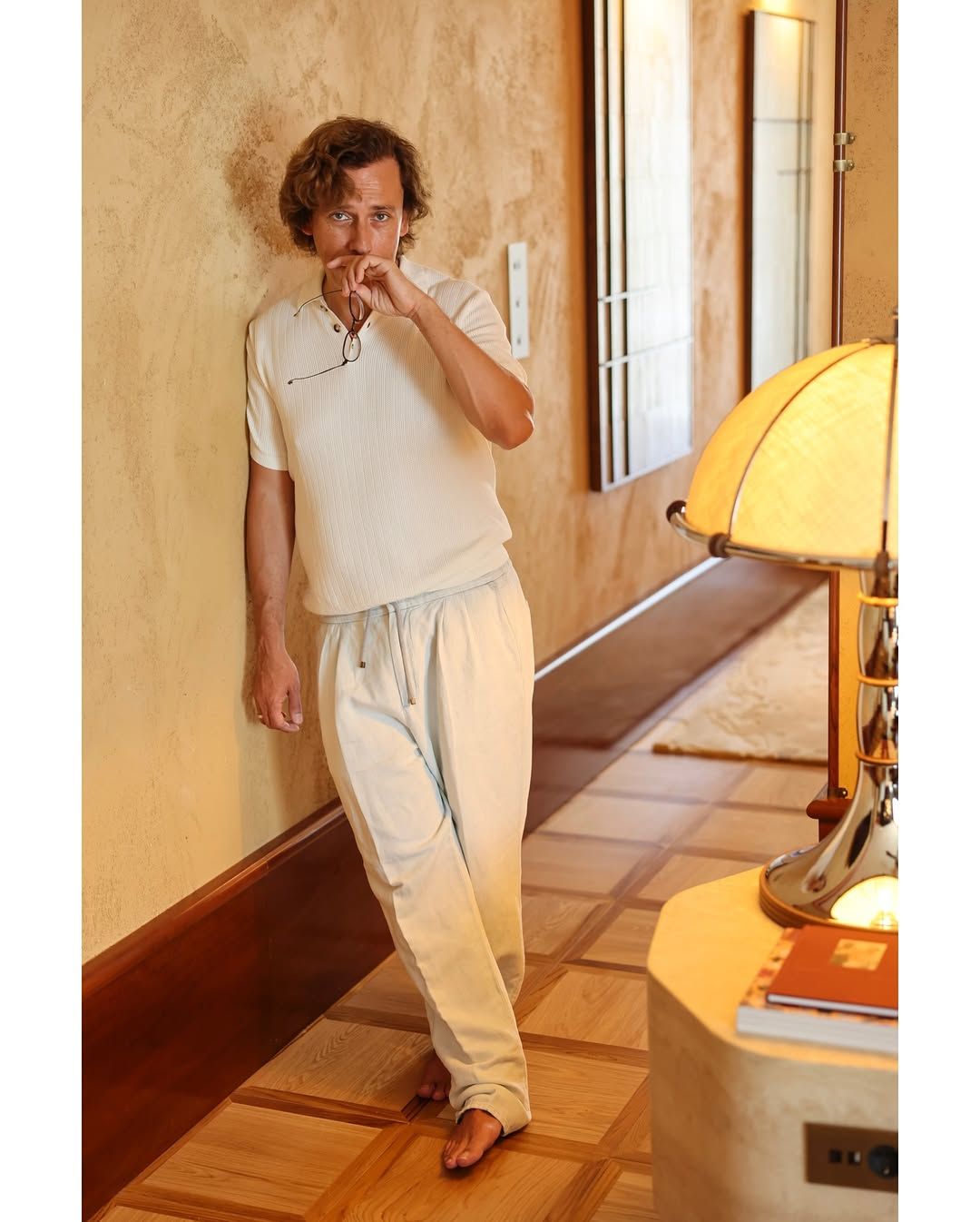 Галкин выбрал для съемки кремовую тенниску и брюки свободного кроя в тон. Позируя в кадре, он оперся плечом на стену.