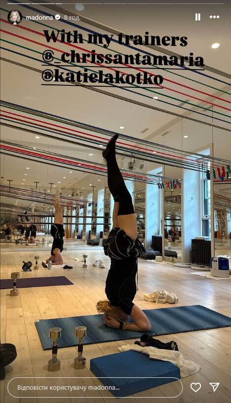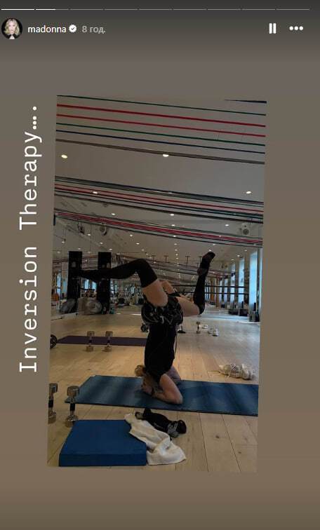 66-летняя американская певица Мадонна 3 июля в Instagram Stories опубликовала фото, на котором запечатлена во время тренировки.