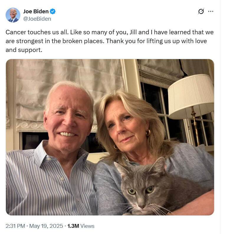 "Рак касается каждого из нас. Как и многие из вас, мы с Джилл поняли, что становимся сильнее именно в самые трудные моменты жизни. Благодарю вас за вашу любовь и поддержку – они дают нам силы", – написал 82-летний Байден.