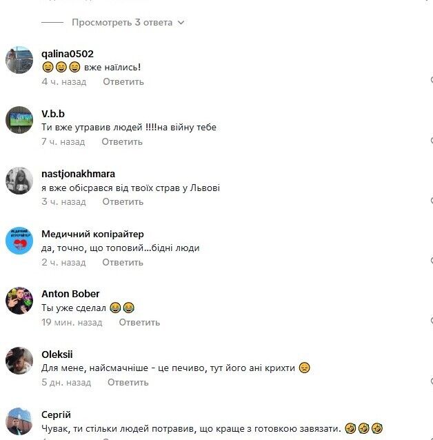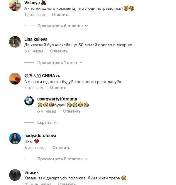 "Уже наелись!", "Классный был чизкейк, что 50 человек попало в больницу", "А я срать от него буду? Это из того ресторана?", "Говорили, там десерт всех положил. Яйца мыть надо", – написали фолловеры.