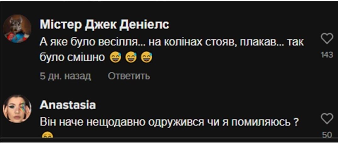 "А какая была свадьба – на коленях стоял, плакал. Так было смешно", – отреагировали в сети.