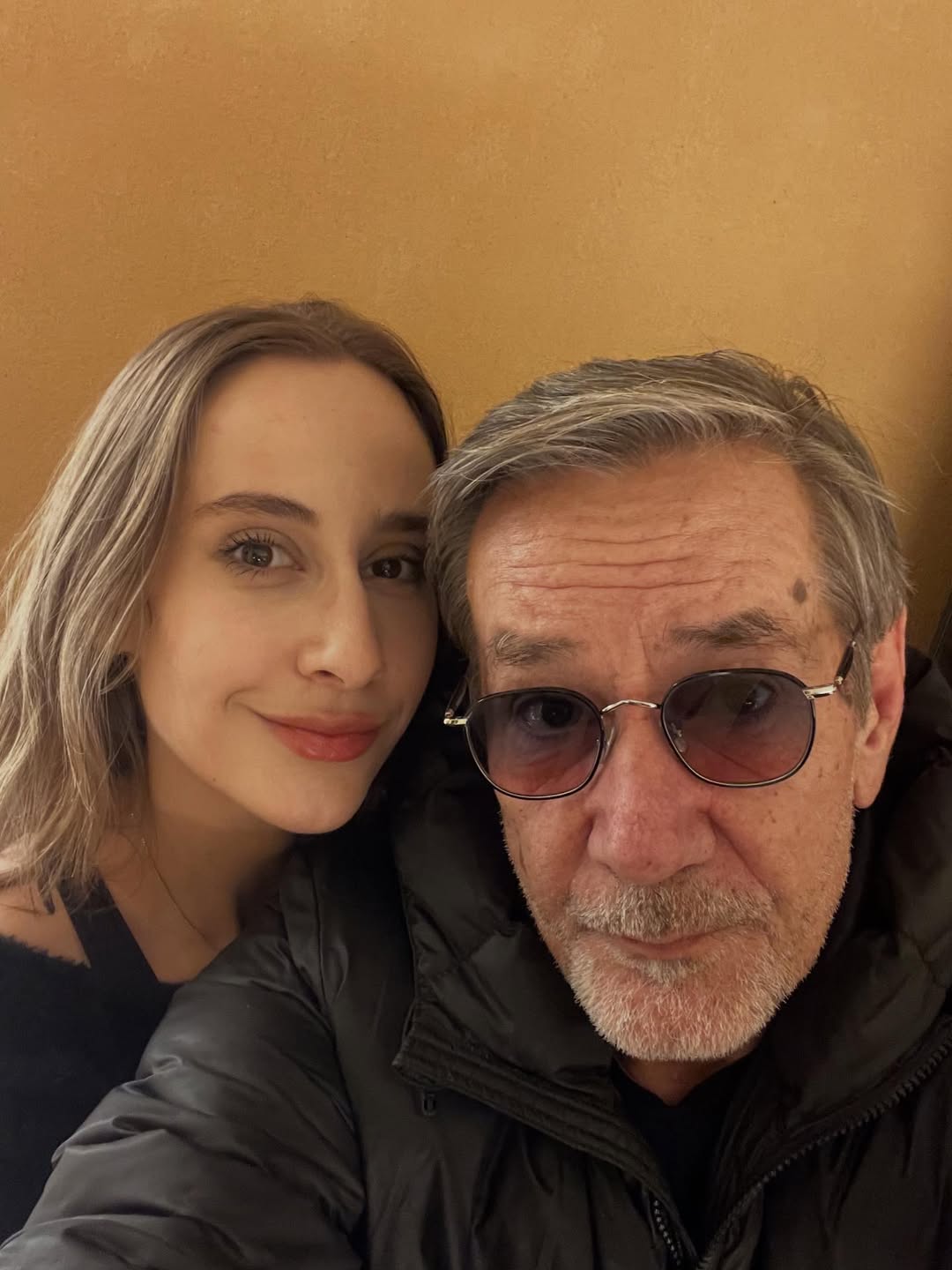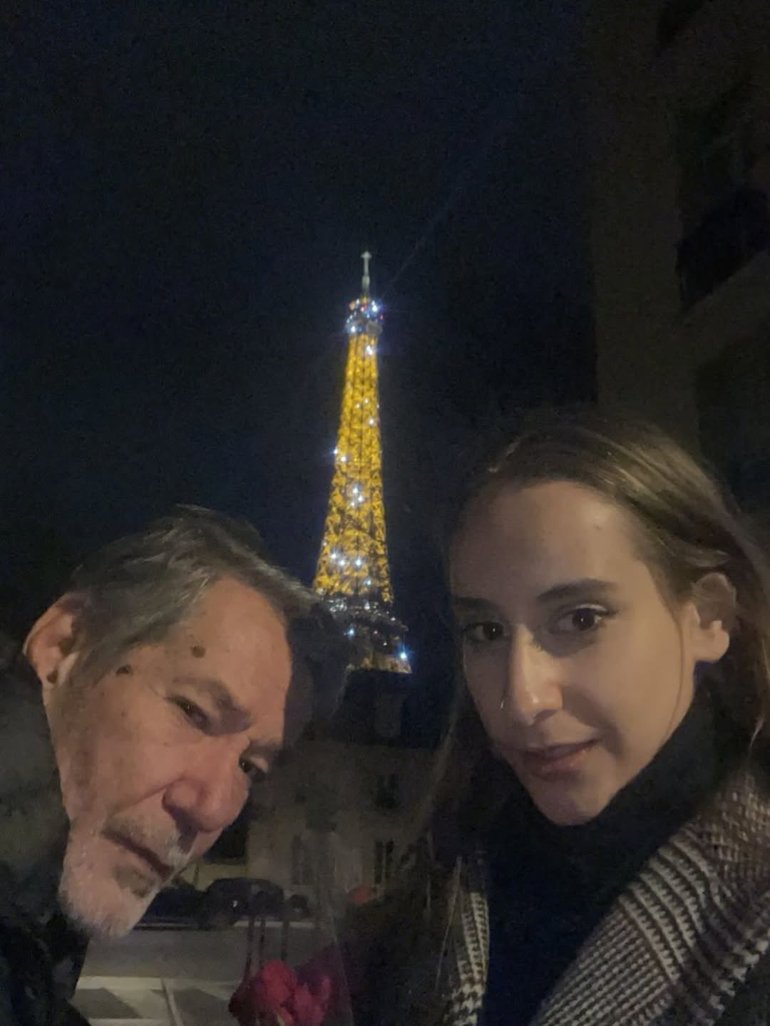 Отец и дочь в кадре позируют на фоне Эйфелевой башни в столице Франции.