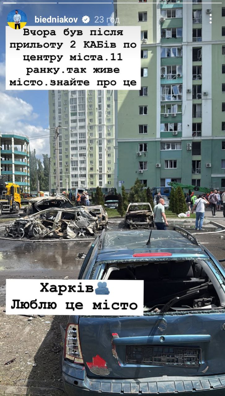 Украинский шоумен Андрей Бедняков 25 июля в Instagram Stories опубликовал фото, сделанное в центре Харькова после попаданий КАБ страны-агрессора России.