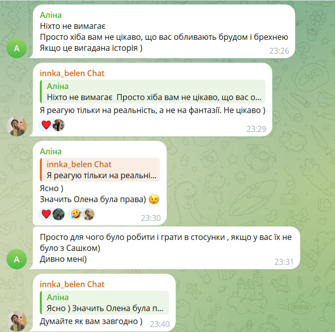 "Ясно, значит, Елена была права. Просто для чего было играть в отношения, если у вас их не было с Сашей?" – продолжила диалог подписчица.