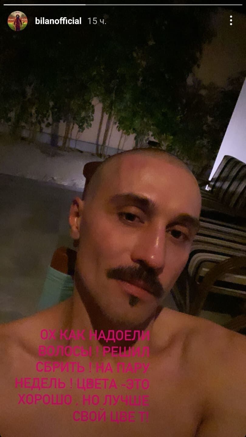 Отдыхающий на Мальдивах российский певец Дима Билан 11 января в Instagram Stories обнародовал фото, на котором запечатлен с бритой головой.