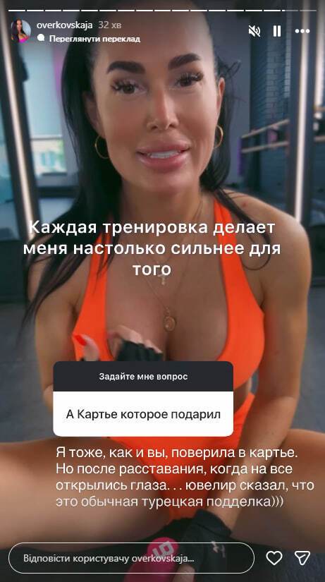 Украинский фитнес-тренер Людмила Оверковская 13 ноября, отвечая на вопросы фолловеров в Instagram Stories, заявила, что бывший бойфренд, украинский бизнесмен турецкого происхождения Мурат Налчаджиоглу подарил на ее 33-летие вместо браслета от французского ювелирного бренда Cartier турецкую подделку.