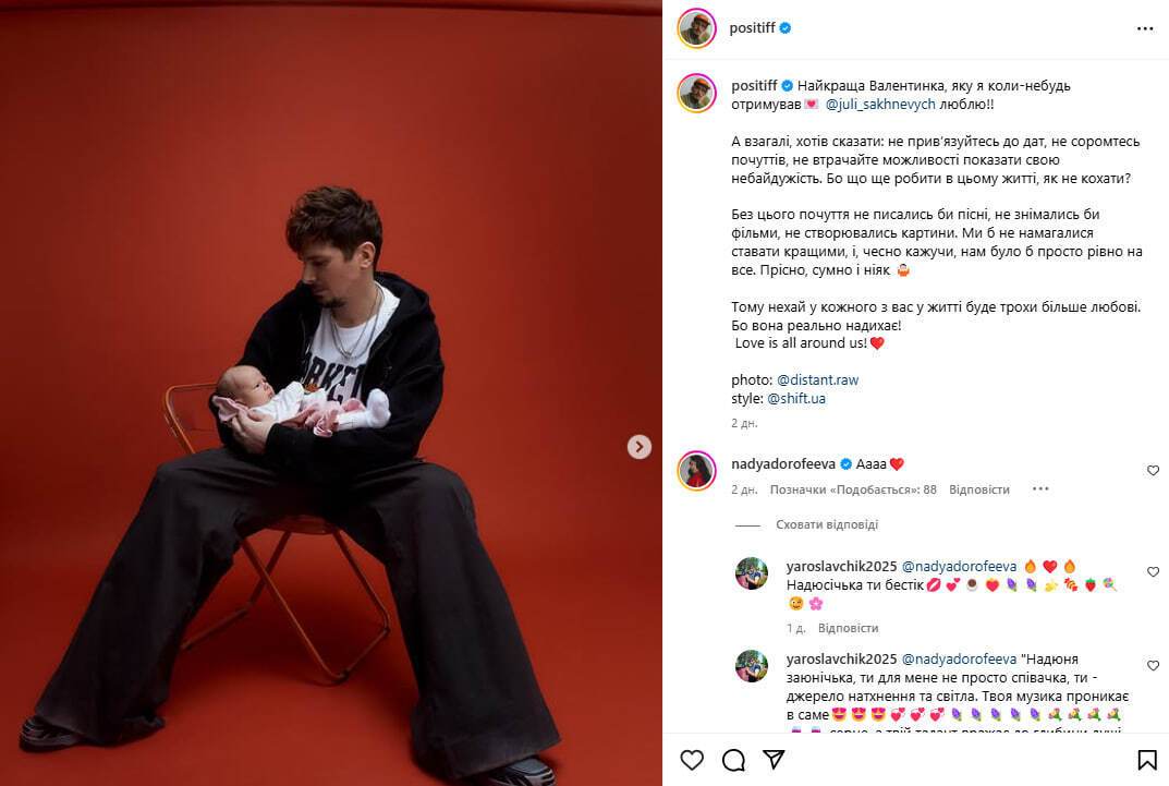 Украинский певец Позитив 14 февраля в Instagram разместил серию новых фото, на которых в том числе запечатлен со своей полуторамесячной дочерью Марией.