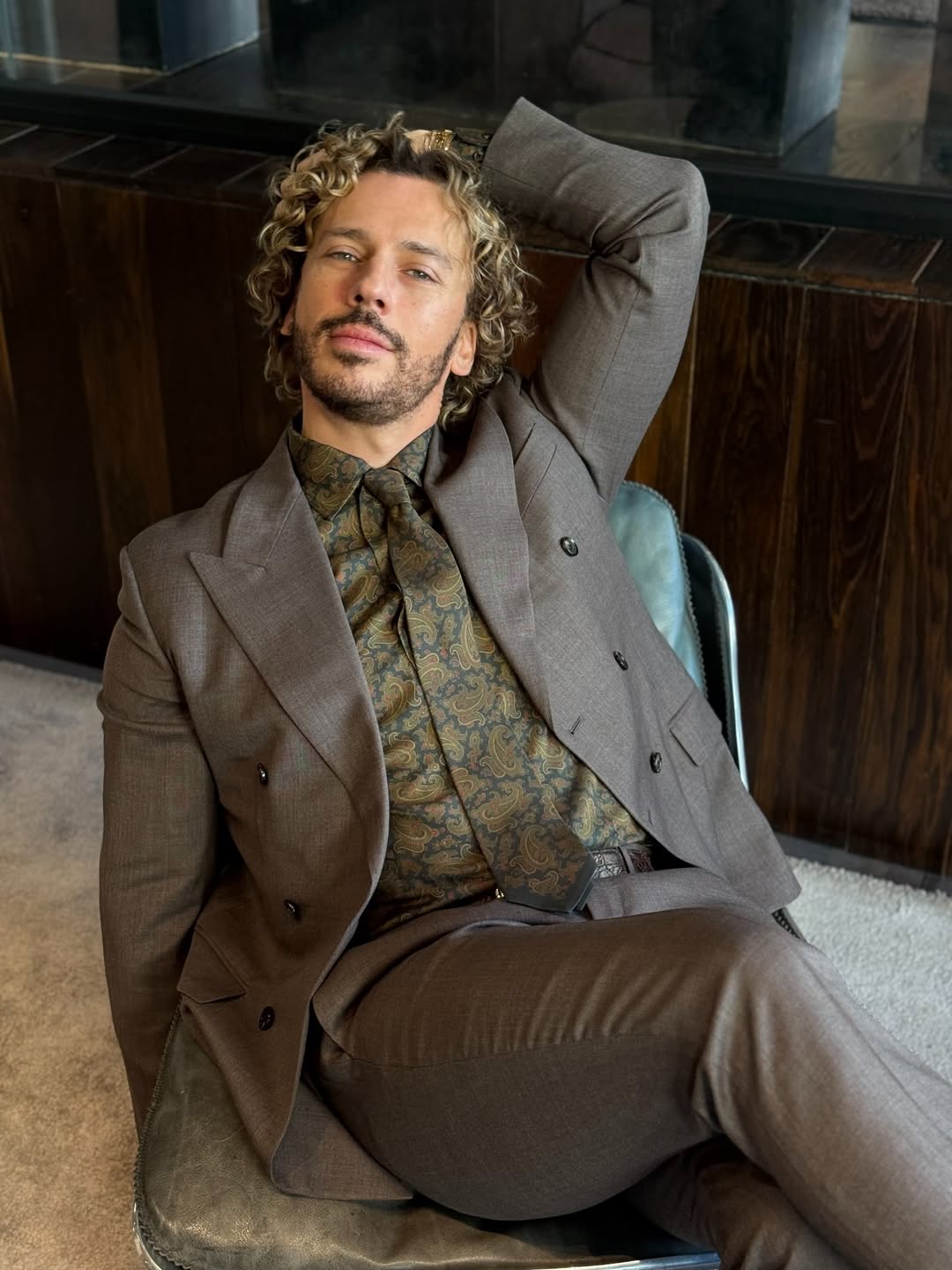 Шоумен разместил свежее фото, для которого позировал в сером костюме, рубашке с узорами и галстуке такой же расцветки. Шоумен предстал с кудрявыми волосами.