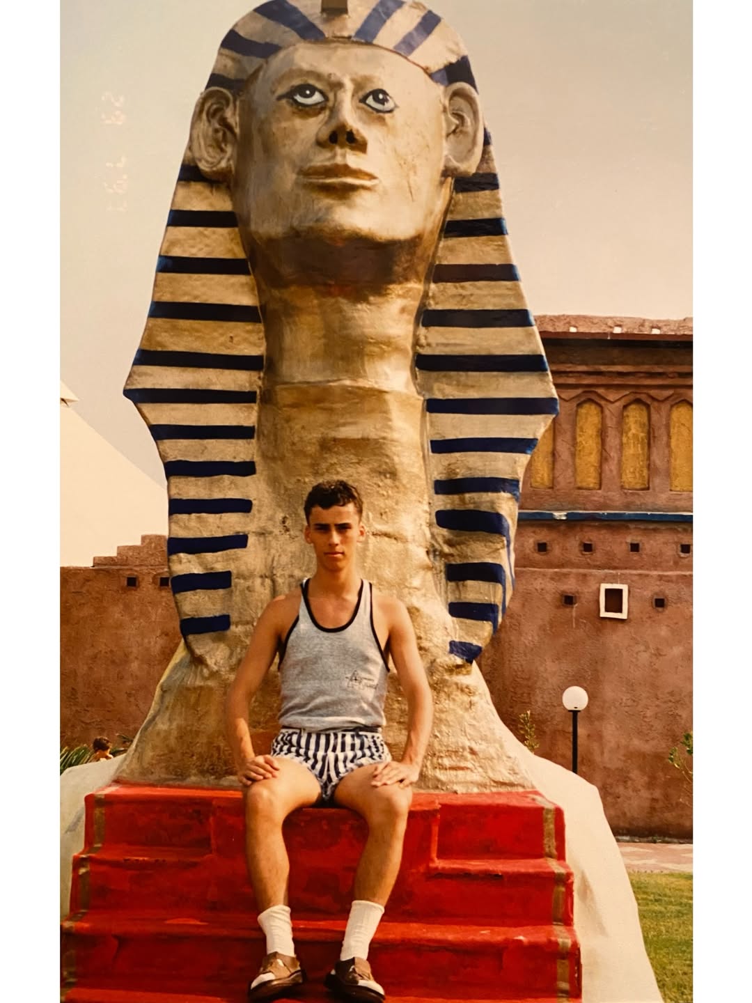 В подборку Галкин добавил еще два снимка времен своей юности. На одном из фото он запечатлен с оголенным торсом и в шортах, на втором – в шортах и майке и сандалиях, надетых на носки. Шоумен позировал на фоне статуи фараона.