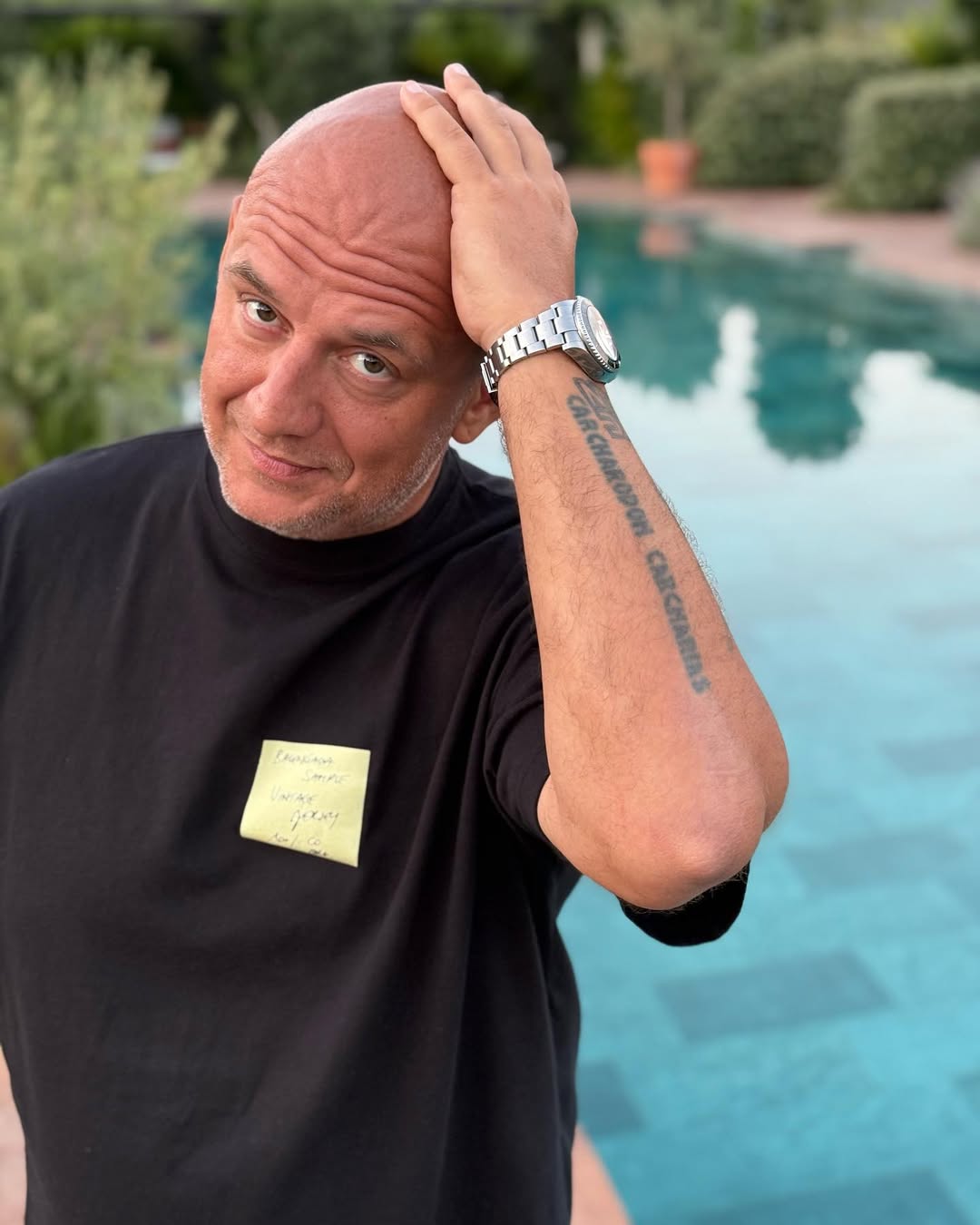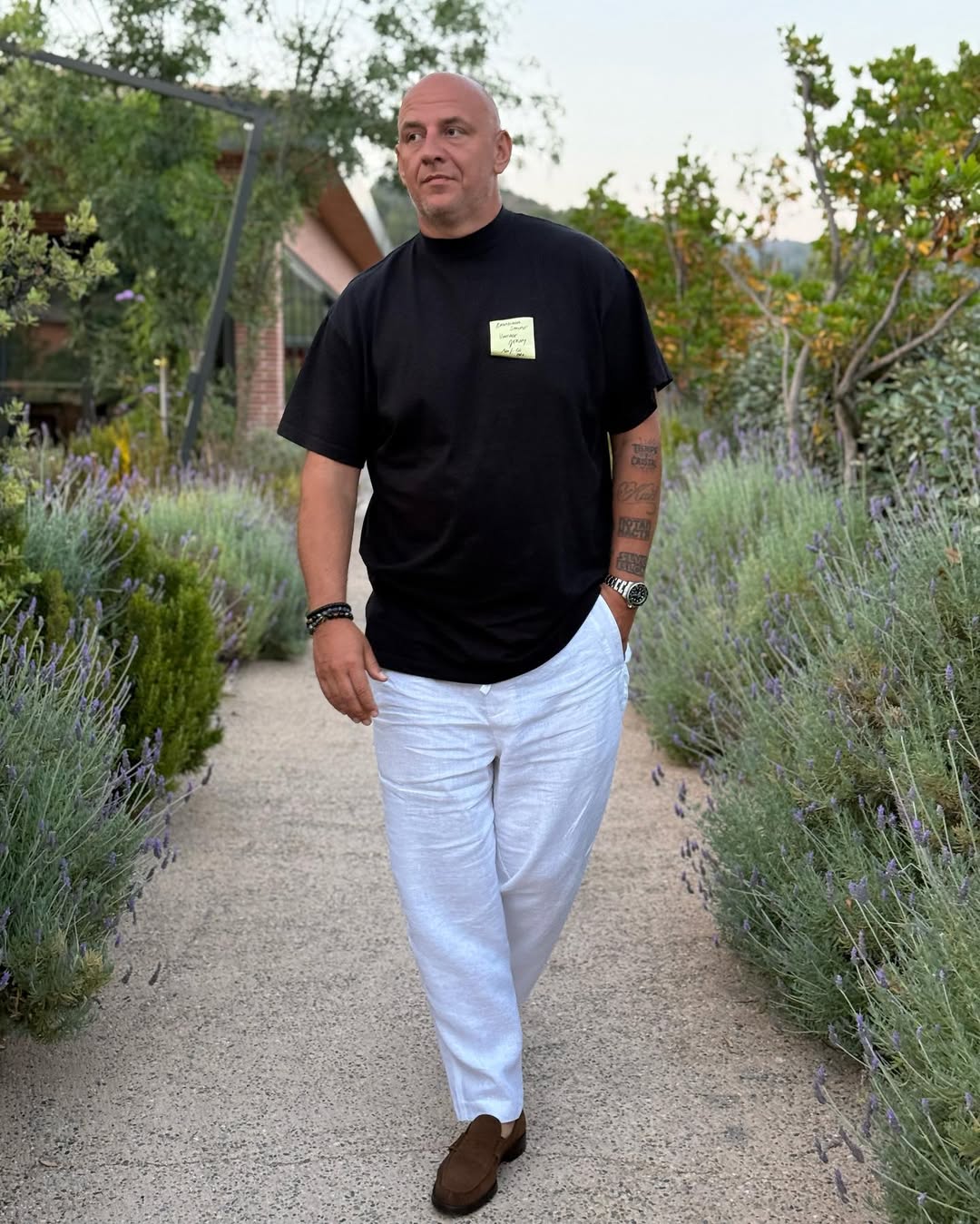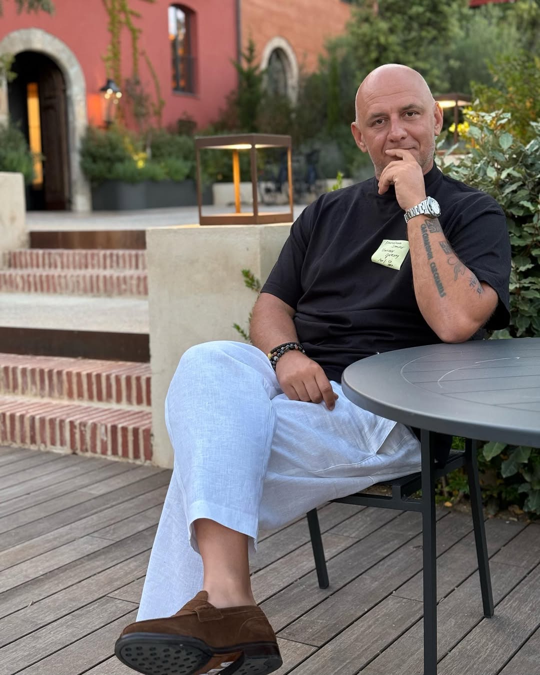 Потап позирует на фоне бассейна под открытым небом. Он показал себя вблизи.