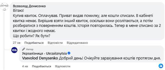 "Укрзалізниця" 11 августа, отвечая на комментарии пассажиров под своим новым постом в Facebook, рассказала, что делать, если банк списал деньги за билеты, а они в приложении так и не появились.