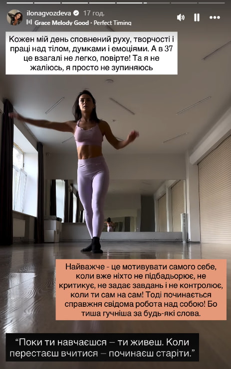 Украинский хореограф Илона Гвоздева призналась, что с возрастом ей все сложнее держать себя в форме, но она продолжает мотивировать саму себя развиваться. Об этом танцовщица рассказала 25 августа в Instagram Stories.