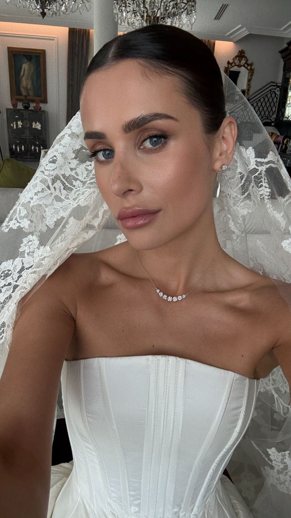 Екатерина Филатова выбрала кружевную фату, а волосы гладко зачесала. Деликатные украшения подчеркивали открытые плечи и шею.