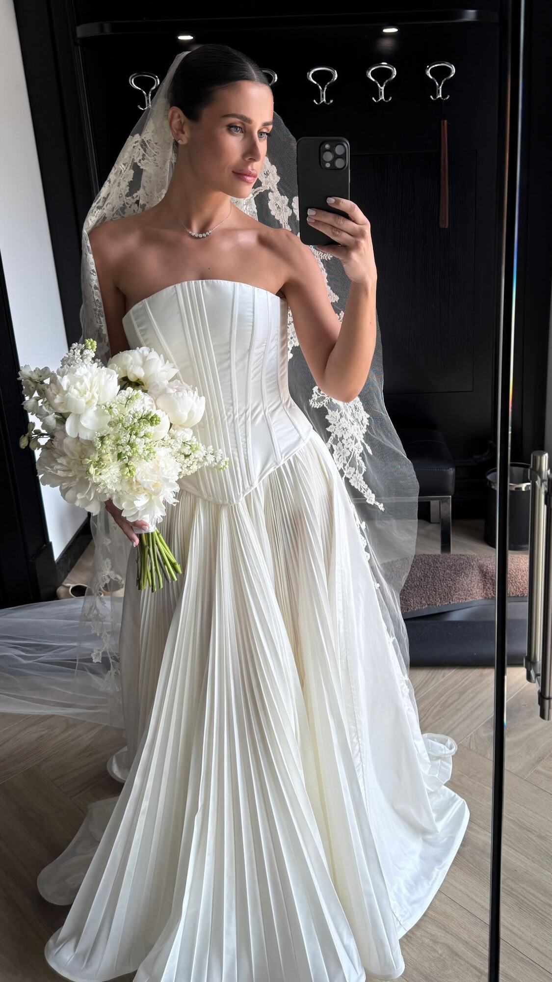 Также Филатова показала себя во весь рост. Она предпочла платье с корсетом и гофрированной юбкой, а в руке держала букет из белых пионов.