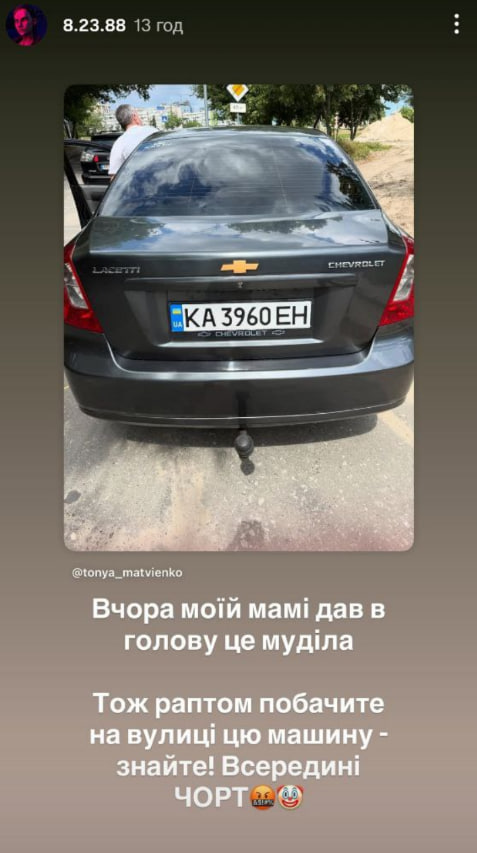 "Вчера моей маме дал в голову этот мудила. Поэтому если вдруг увидите на улице эту машину, знайте: внутри – черт", написала дочь артистки.