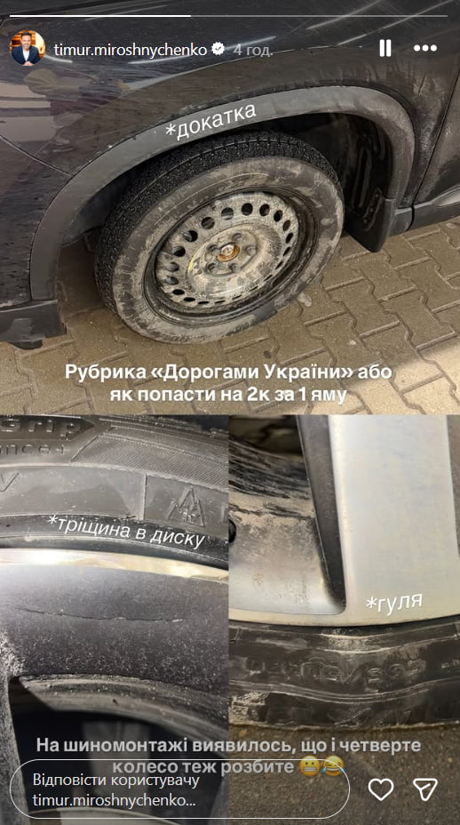 Украинский ведущий Тимур Мирошниченко поделился с подписчиками грустной новостью – он въехал на машине в яму и значительно повредил колеса и диски. Об этом он сообщил 27 февраля в Instagram Stories, разместив фото и видео поврежденного авто.