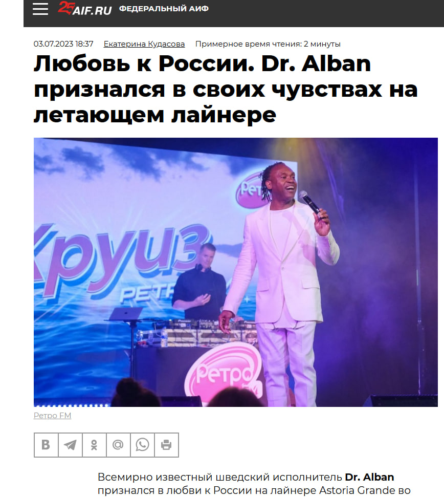 Как отмечает пропагандистский сайт AIF.ru, летом 2023 года Dr. Alban развлекал на круизном лайнере россиян и прямым текстом заявил, что "любит Россию".