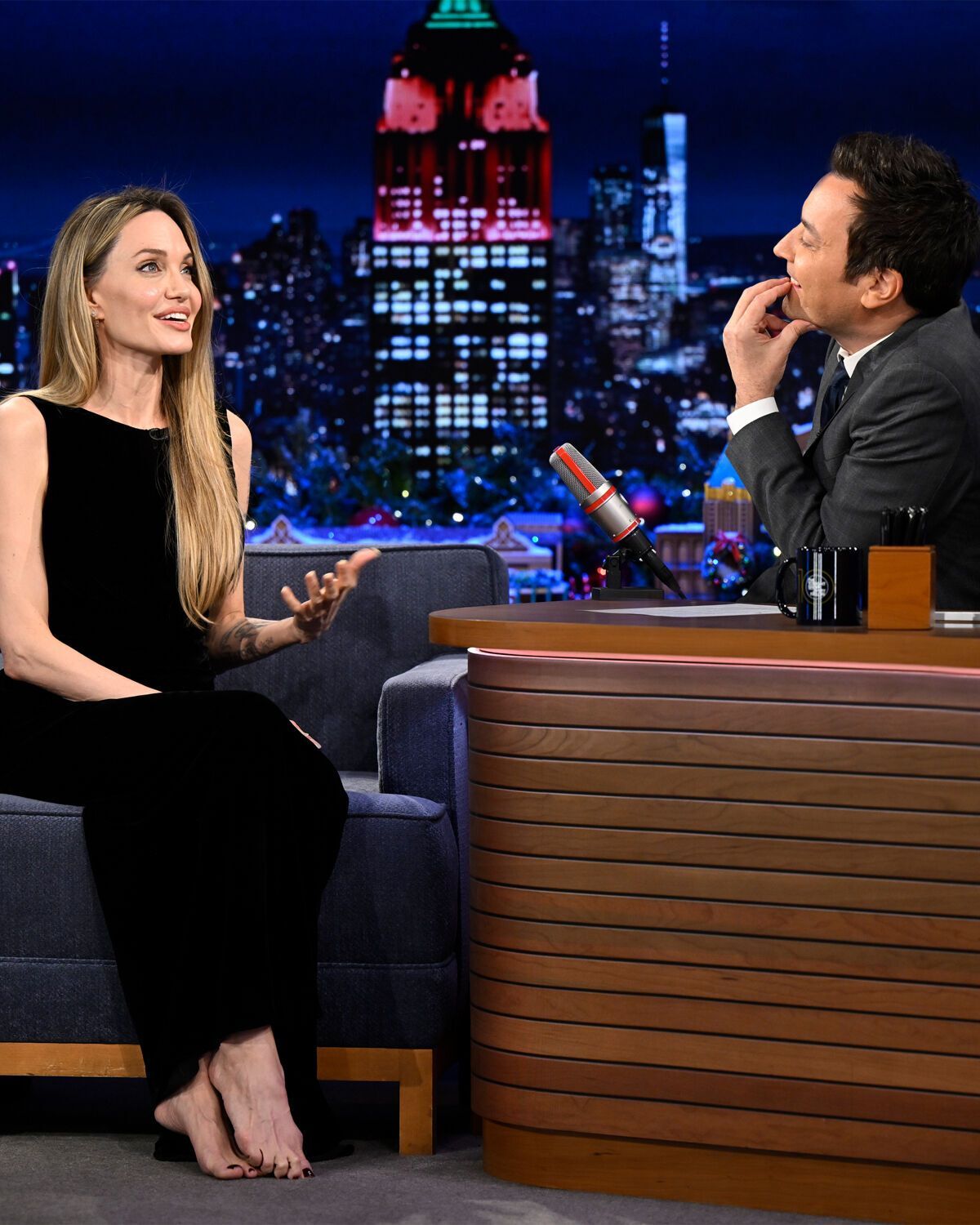 Ведущий шоу, американский комик Джимми Фэллон обратил внимание, что Джоли сидит босиком. Он в шутку спросил, не забыла ли актриса случайно дома обувь.