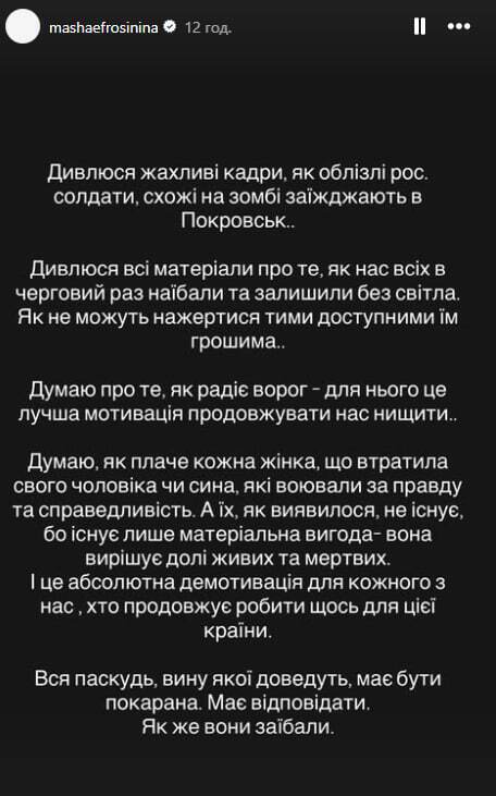 "Смотрю ужасные кадры, как облезшие русские солдаты, похожие на зомби, заезжают в Покровск... Смотрю все материалы, как нас всех в очередной раз на...бали и оставили без света. Как не могут нажраться теми доступными им деньгами", – написала ведущая.