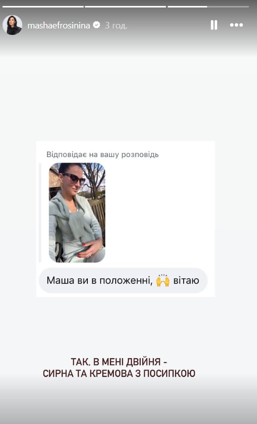 Украинская ведущая Маша Ефросинина 13 апреля в Instagram Stories отреагировала на поздравление подписчицы с грядущим пополнением в семье.