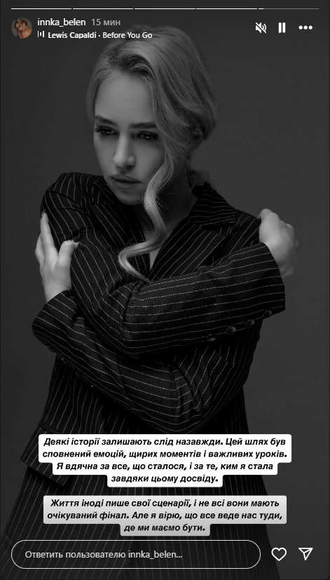 "Некоторые истории оставляют след навсегда. Этот путь был наполнен эмоциями, искренними моментами и важными уроками. Я благодарна за все, что произошло, и за то, кем я стала благодаря этому опыту", – написала Белень.