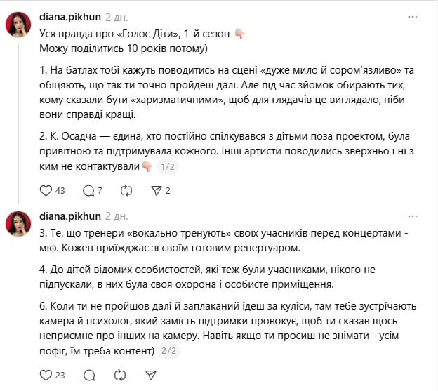 "Вся правда о "Голос. Діти", первый сезон. Могу поделиться 10 лет спустя, – написала она. – На батлах тебе говорят вести себя на сцене "очень мило и застенчиво" и обещают, что так ты точно пройдешь дальше. Но во время съемок выбирают тех, кому сказали быть "харизматичными", чтобы для зрителей это выглядело, будто они действительно лучше".