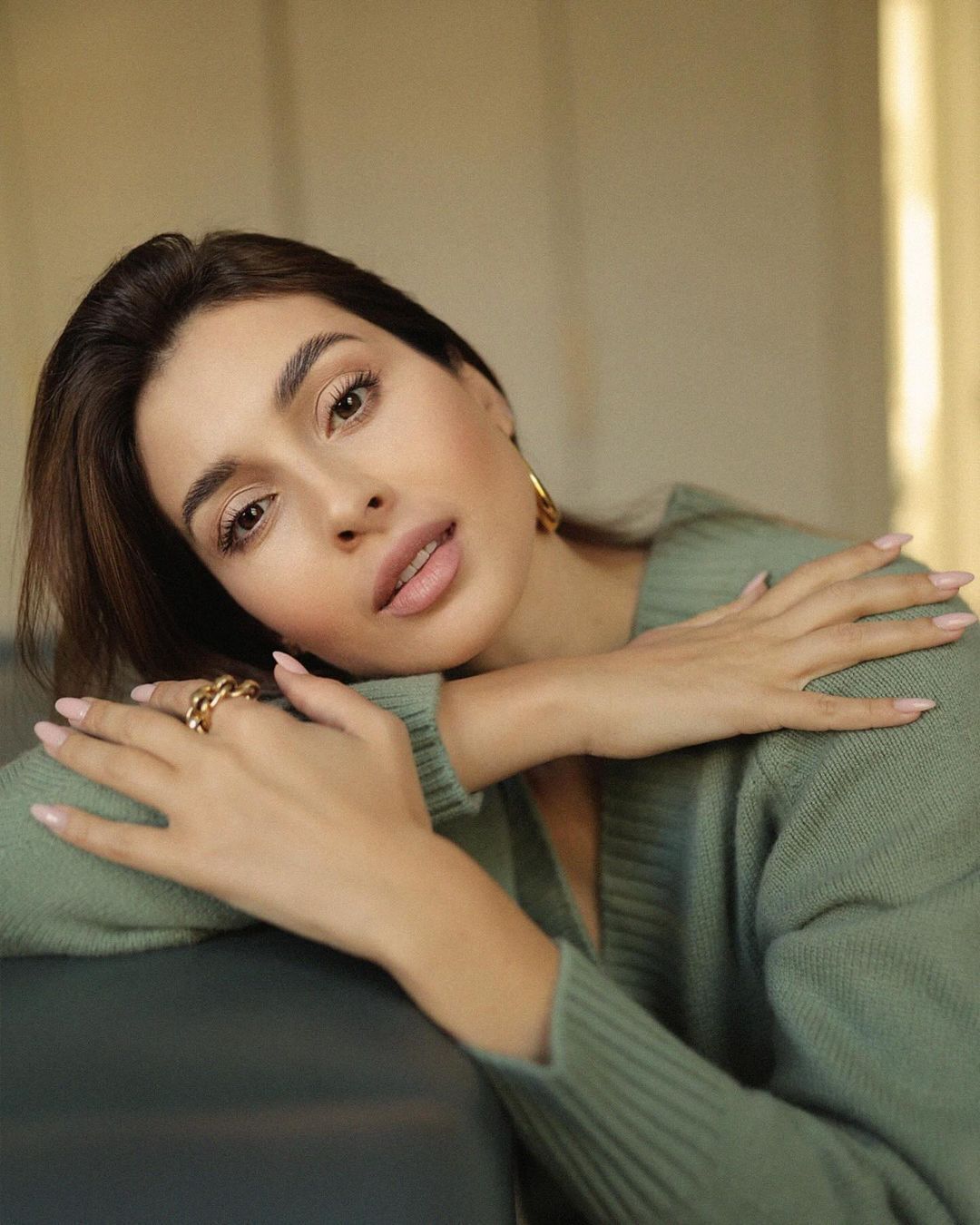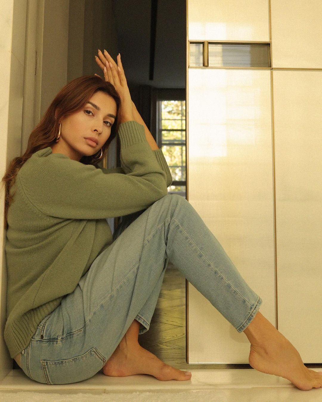 Она снялась с легким макияжем на лице, в оливковом свитере, голубых джинсах и с массивными украшениями из желтого металла.