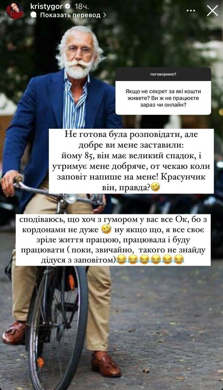 "Не готова была рассказывать, но хорошо, вы меня заставили: ему 85, у него большое наследство, и он хорошо меня содержит. Вот жду, когда он на меня завещание напишет. Красавчик он, правда же?" – написала Кристина и прикрепила фото пожилого мужчины на велосипеде.